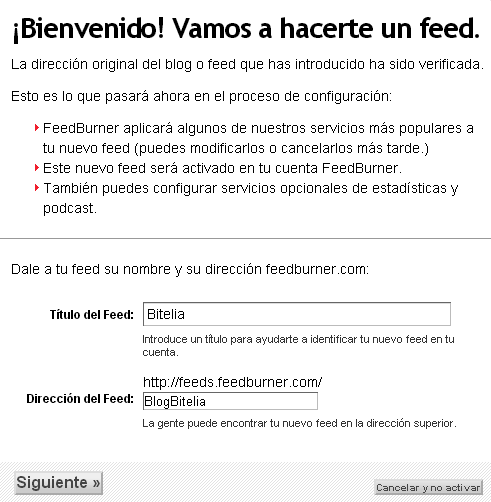 - Aparece una pantalla en la que pondremos título al feed y una dirección que lo identifique (BlogBitelia). A continuación pulsamos el botón Siguiente.