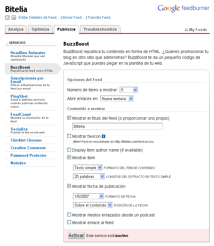 Pulsamos en la pestaña Publicize(Publicita tu Feed) y hacemos clic en el servicio BuzzBoost(Publica tu blog como HTML).