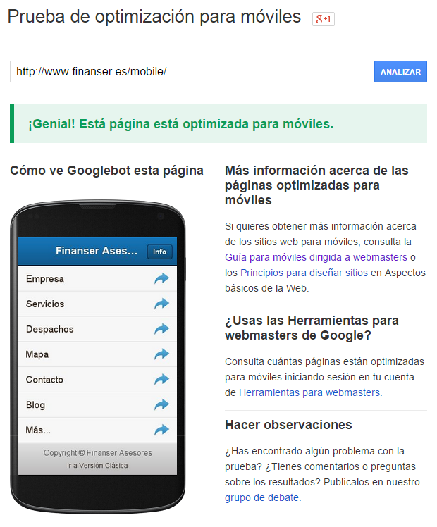 Prueba de optimización para móviles (mobile-friendly): introduce la url de tu web y te indicará si la página tiene un diseño optimizado para móviles.